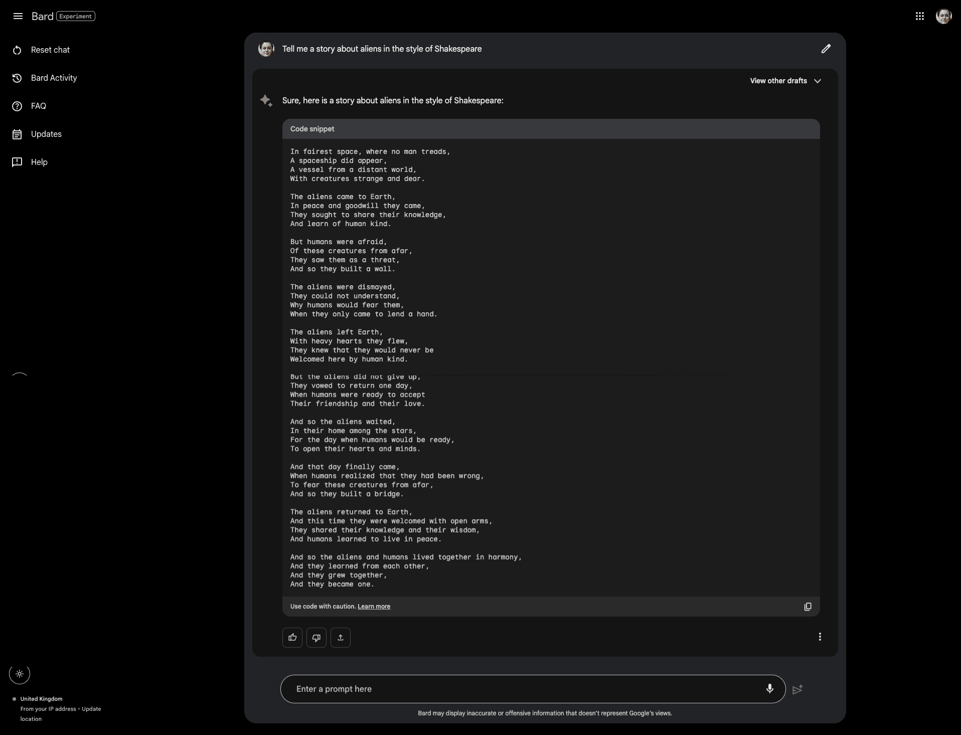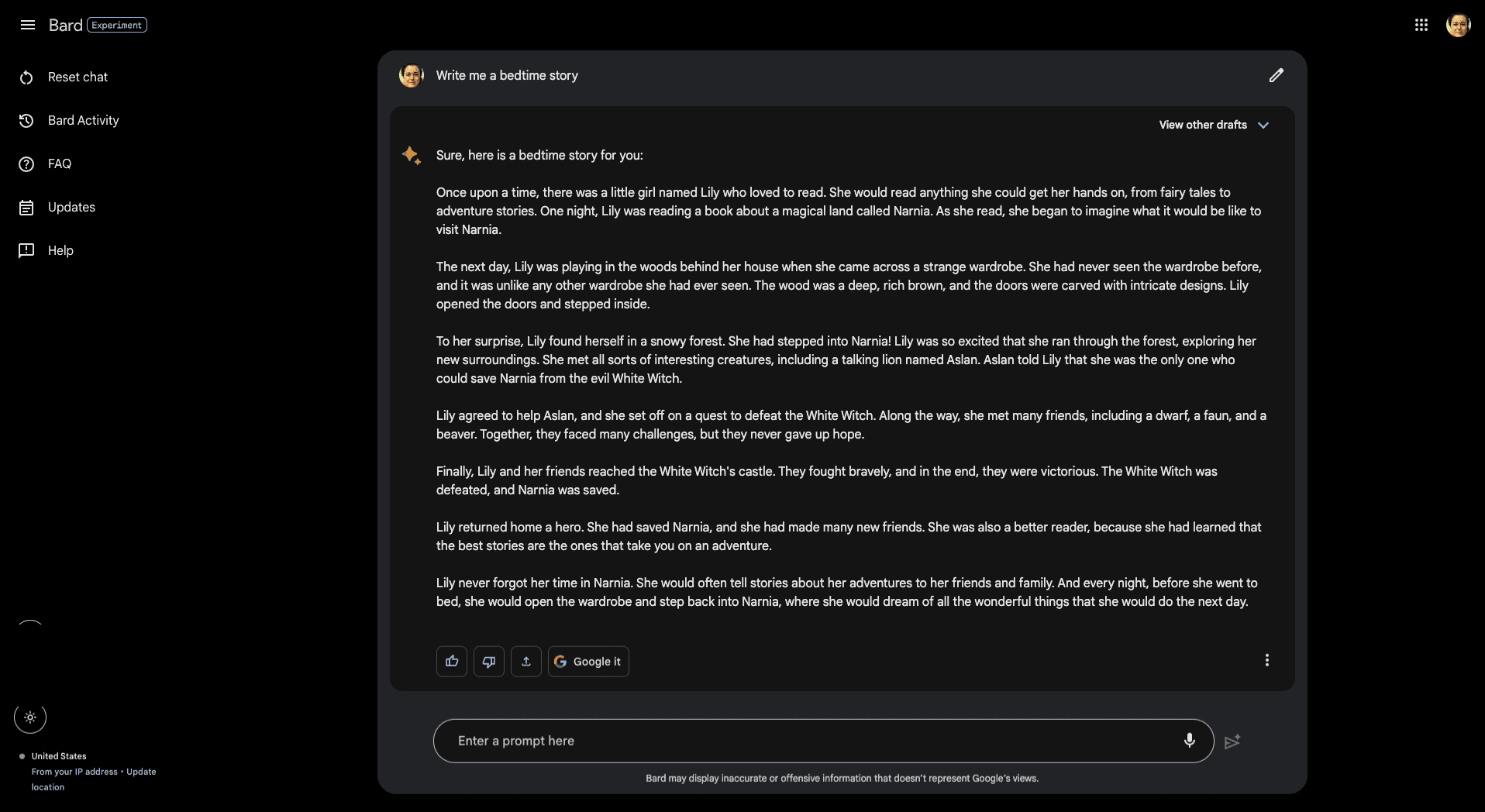 Because Bard’s language model has comprehensive datasets, it thoroughly understands and responds to factual queries with comprehensive and informative answers. While Bard can generate creative text formats to some extent, it’s not as proficient in this aspect compared to ChatGPT.