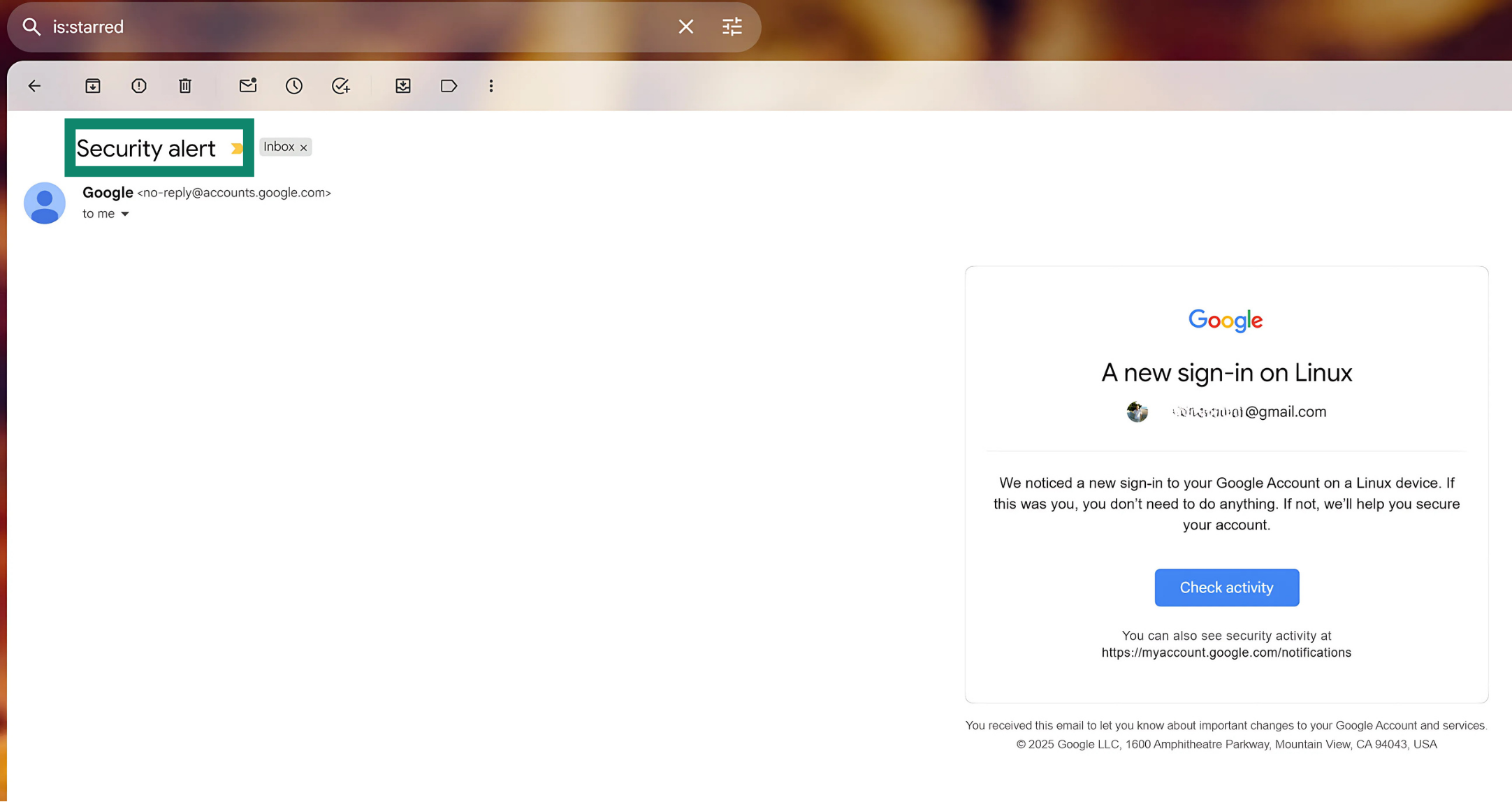 You’ll also get an alert if Google blocks a sensitive action, like someone trying to view your saved passwords. Just be cautious: scammers sometimes send fake alerts, so it's important to verify the legitimacy of any message by checking your Google account settings for a matching alert.