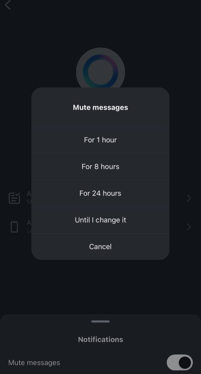 - Tap on “Notifications”, toggle it to “Mute”, and select “Always”.