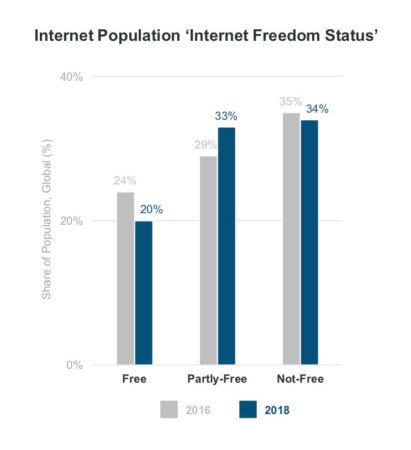 A decreasing share of the global online population lives in countries that have zero internet censorship—20% in 2018, compared to 24% in 2016. A third of users online experience a partially uncensored internet, and another third live in countries without any internet freedom at all.