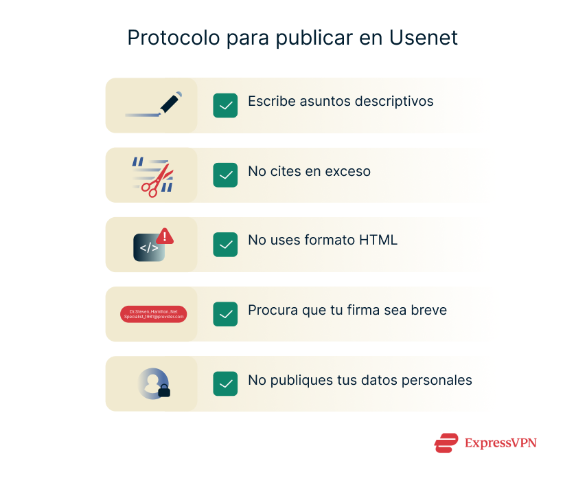 - No publiques tus datos personales: Usenet es una red pública y permanente, por lo que todo lo que publiques permanecerá accesible durante mucho tiempo. Por lo tanto, es aconsejable evitar publicar datos personales.