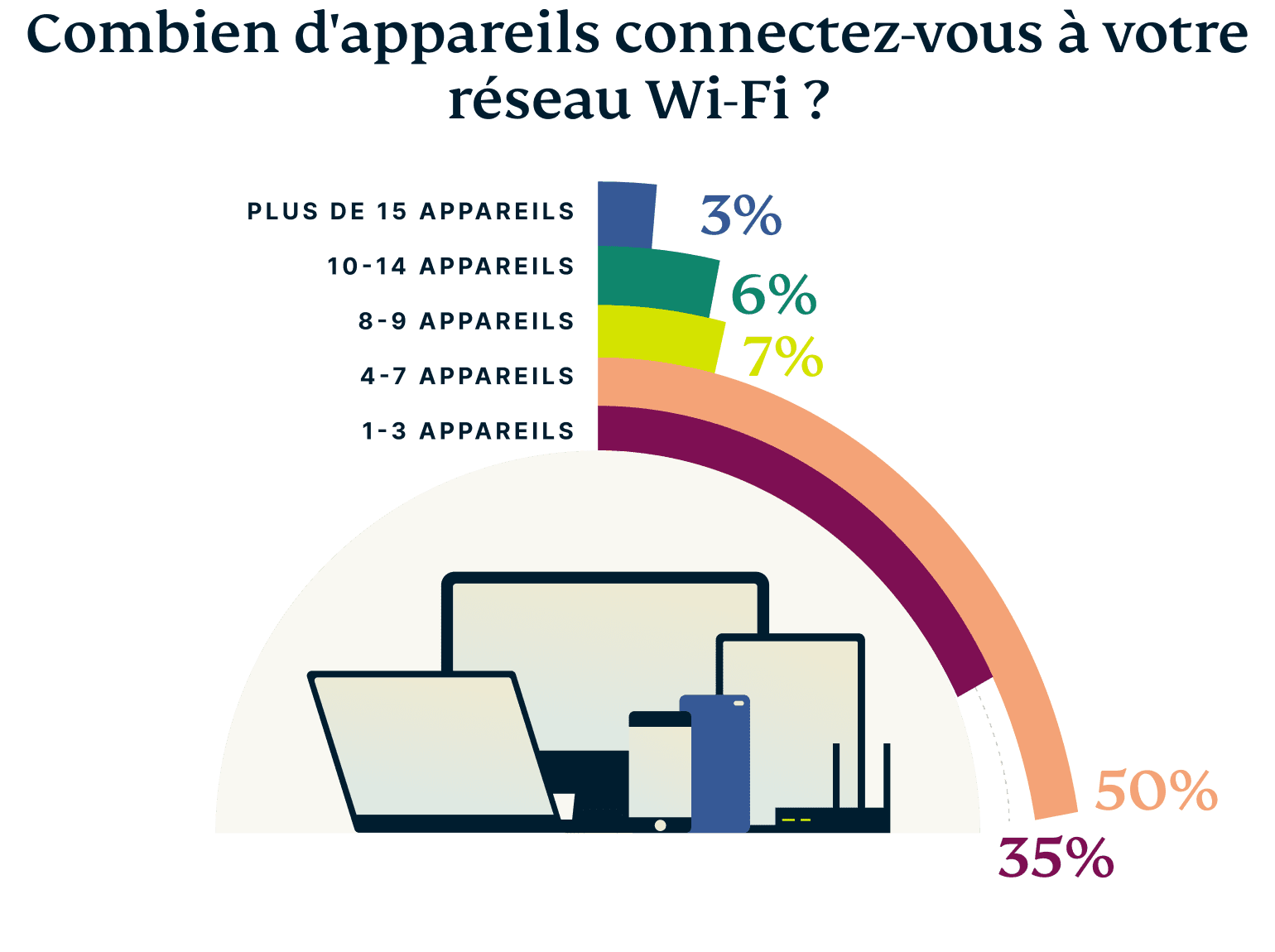 Alors que plus de 90 % des Français ont désormais un accès internet, une grande majorité d'entre eux utilise quotidiennement le Wi-Fi dans différents contextes : à la maison, au travail ou dans les espaces publics. Cette généralisation du Wi-Fi s'est traduite par une augmentation significative de l'utilisation des appareils intelligents dans notre vie quotidienne. Aujourd'hui, une personne connecte 5 appareils en moyenne à son réseau Wi-Fi. Ces appareils sont notamment des smartphones, des ordinateurs portables, des Smart TV, des thermostats, et même des appareils électroménagers intelligents.