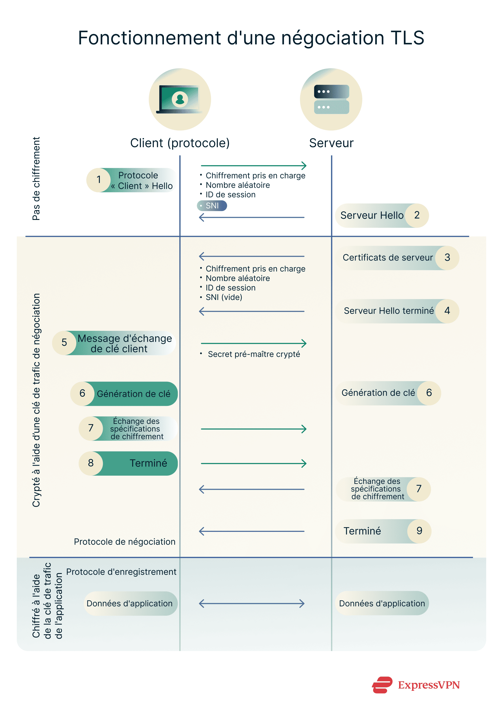 Il est important de savoir que, même si la négociation TLS aboutit finalement à l'établissement d'une connexion sécurisée, sa première partie n'est pas cryptée. À moins que le site web n'utilise un protocole (« Client ») encrypté Hello (ce qui n'est pas le cas de nombreux sites Web), il s'agit là d'un autre point du processus où le nom de domaine que vous essayez d'atteindre peut être divulgué (votre navigateur l'envoie au serveur en texte clair).