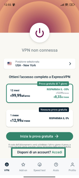3. Avvia ExpressVPN e tocca il pulsante Accedi per entrare nell'app con le tue credenziali.