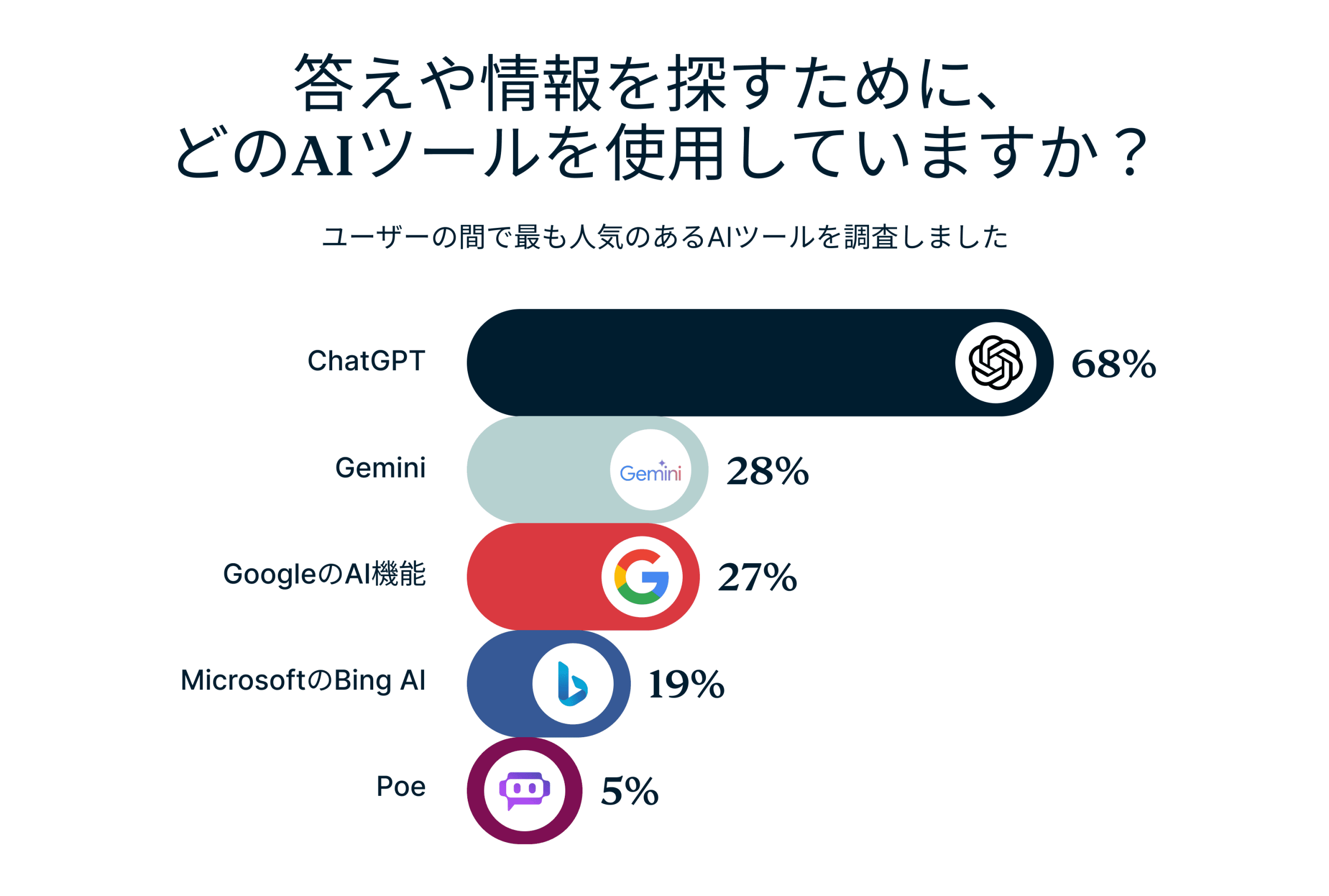 AIツールに関しては、ChatGPTが圧倒的な支持を得ています。約7割(68%)のユーザーが回答ツールとしてChatGPTを選び、競合のGemini(28%)やBard(27%)は後れを取っています。ChatGPTの対話形式と詳細な回答能力は特に若い世代に人気で、パーソナライズされ、魅力的な回答を求めるユーザーにとって人気のツールとなっています。