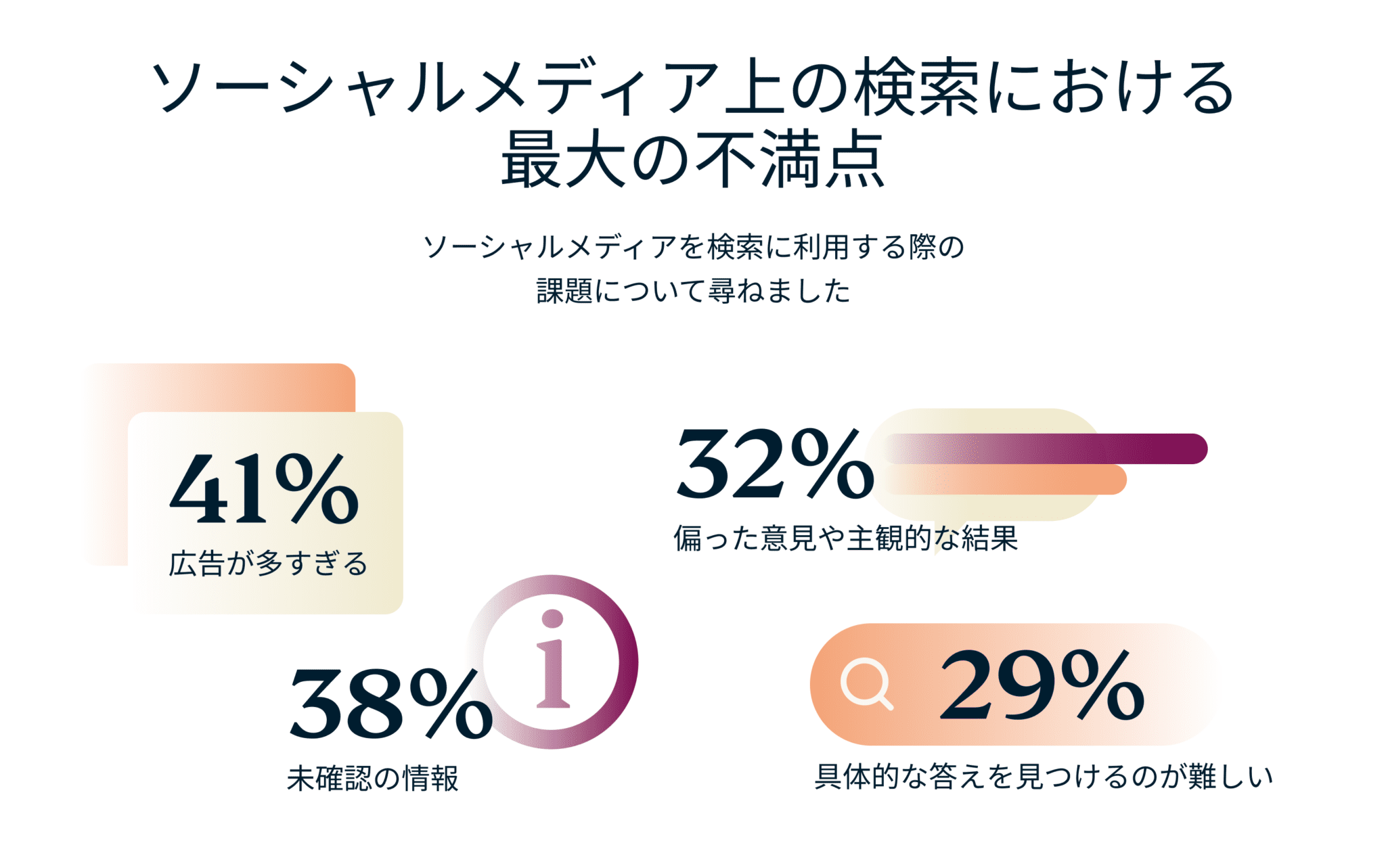 ソーシャルメディアの強みは、パーソナライズされ、コミュニティ主導のコンテンツにあります。しかし、その強みが弱点にもなり得ます。約32%のユーザーが、偏見や過度に意見に依存した検索結果に不満を感じています。おすすめ情報やレビューはしばしば主観的であり、偏った認識を生み出し、バランスの取れた結論を導き出すことを難しくしています。
