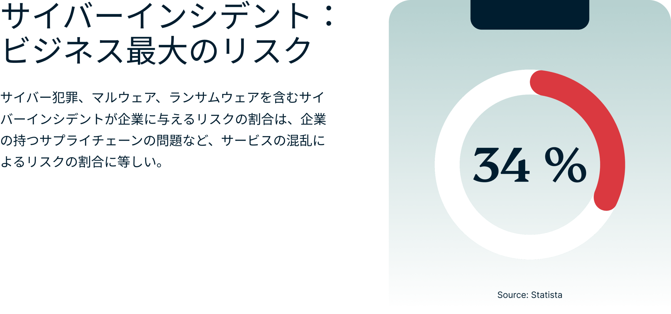 Statistaが業界リーダーを対象に実施した調査によると、サイバー攻撃はビジネスにとって最大の脅威のひとつであり、次いでビジネスの中断、マクロ経済の発展への影響があること明らかになりました。2018年から2023年までの調査によると、回答者の34%がサイバー事件を最大の懸念事項としています。