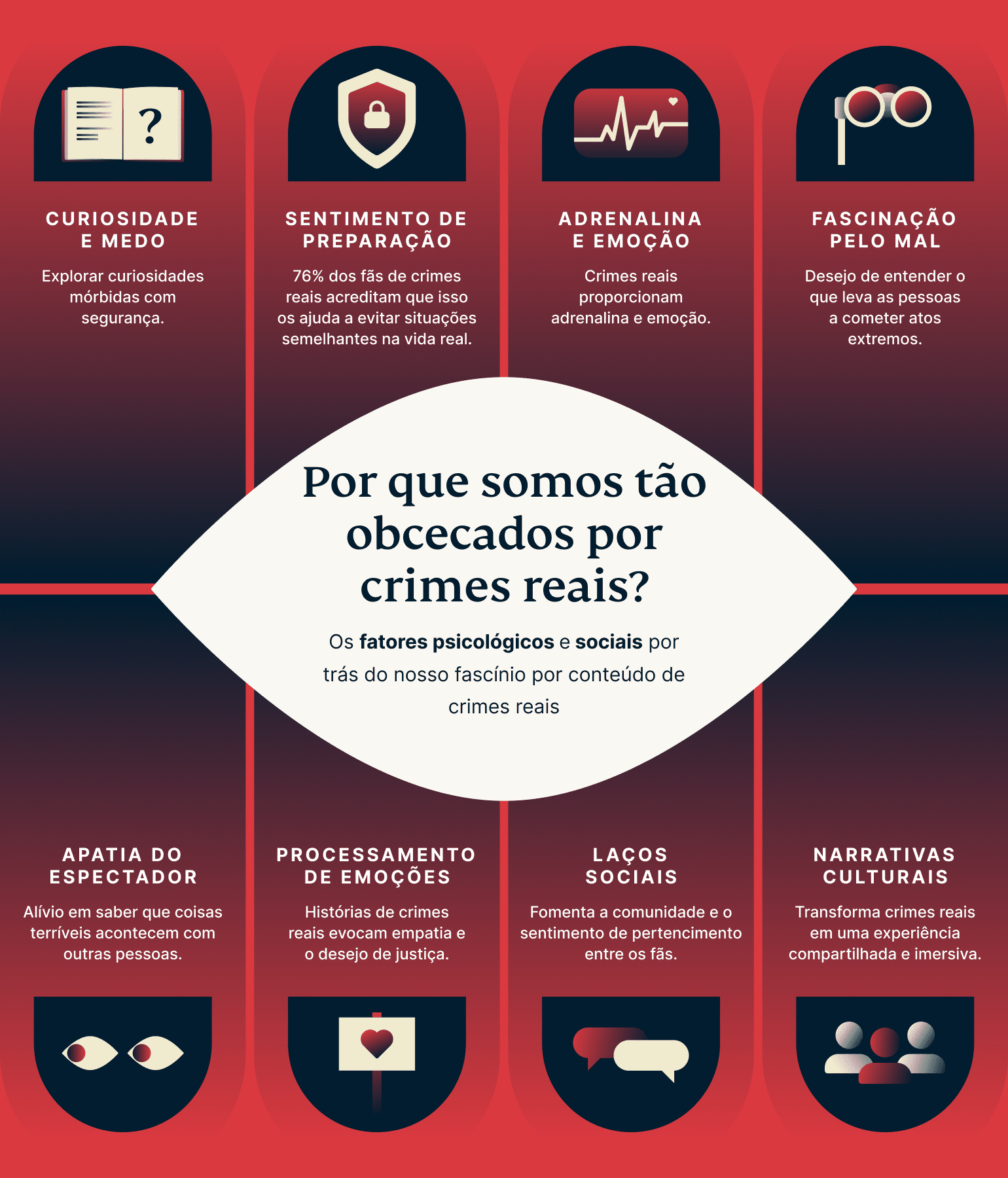 • Fatores psicológicos como curiosidade, controle do medo e busca de emoção alimentam nossa obsessão por crimes reais.