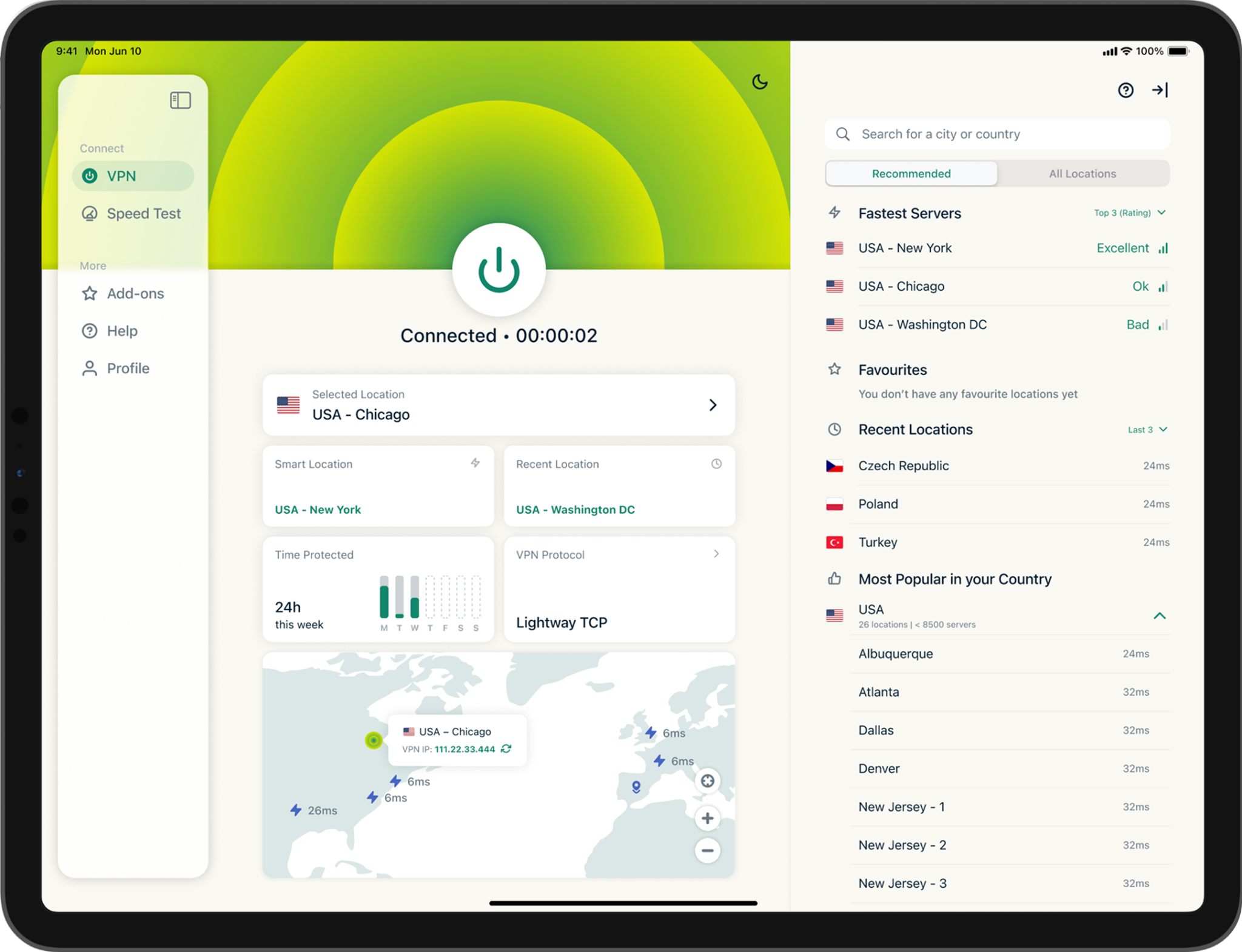 An iPad is often a travel companion or a living-room screen. It deserves an app that treats it like a first-class device. The redesigned ExpressVPN experience uses the larger display to make everyday tasks simpler. Connecting takes fewer steps. Switching locations is easier to scan and select. Speed checks and settings are within easy reach, whether you hold the iPad in portrait or landscape. Small refinements add up, and the result is a VPN that is quicker to use and easier to keep on.