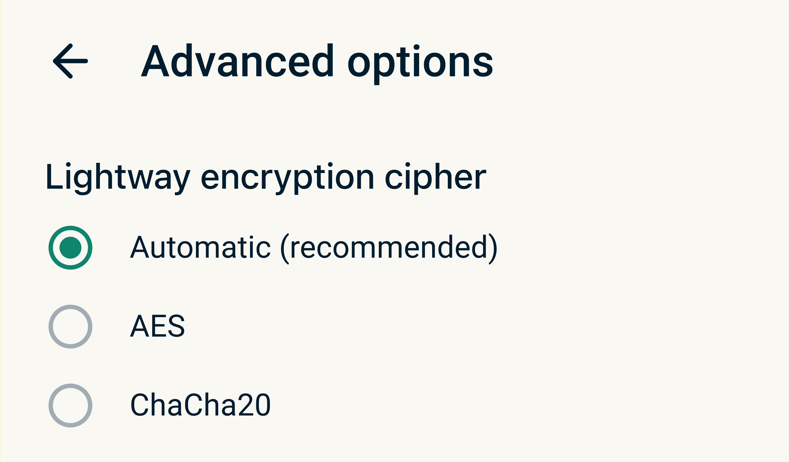 Lightway encryption cipher selection is now available on the ExpressVPN app for iOS, Android, and Windows. Go to your app’s protocol settings and you’ll see “Advanced options” under Lightway UDP and TCP. As always, if you are not sure what protocol settings to use, simply choose “Automatic.”