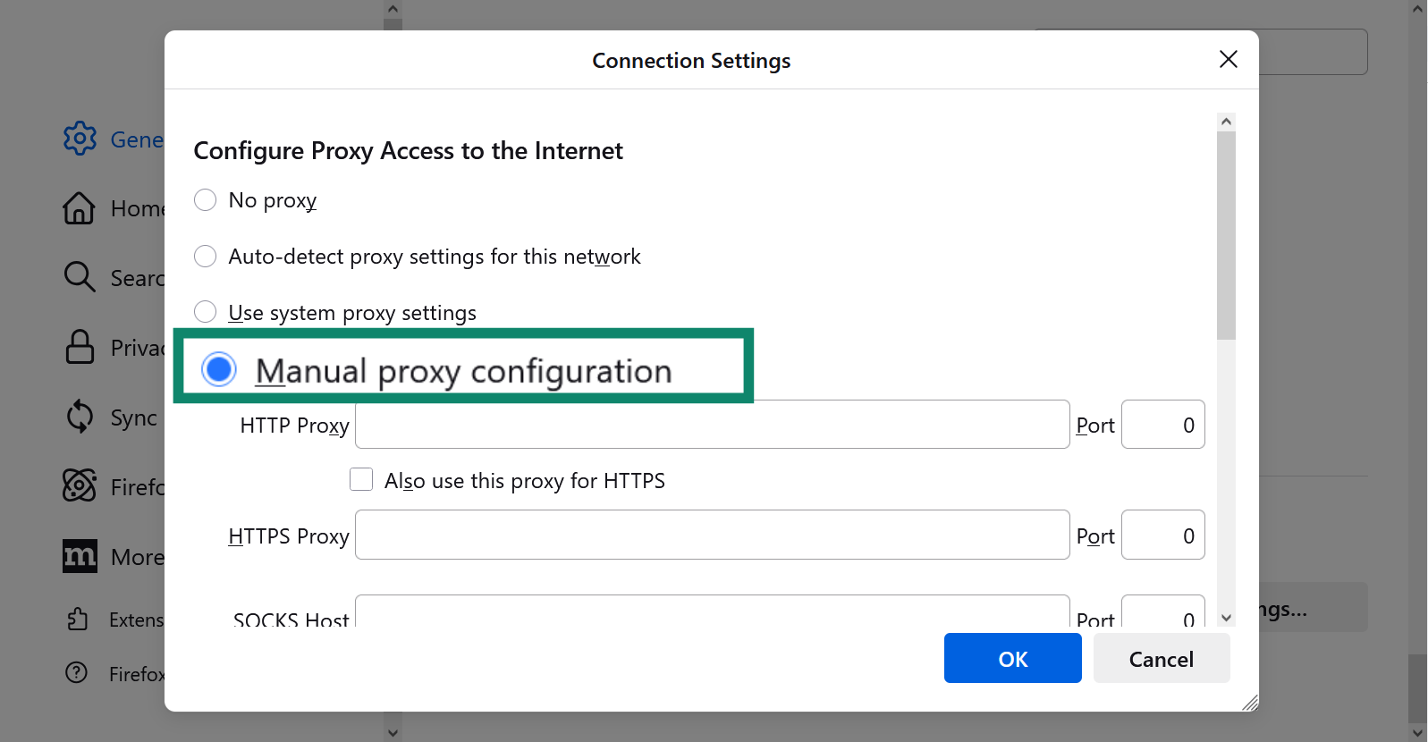 - Choose Manual proxy configurations.