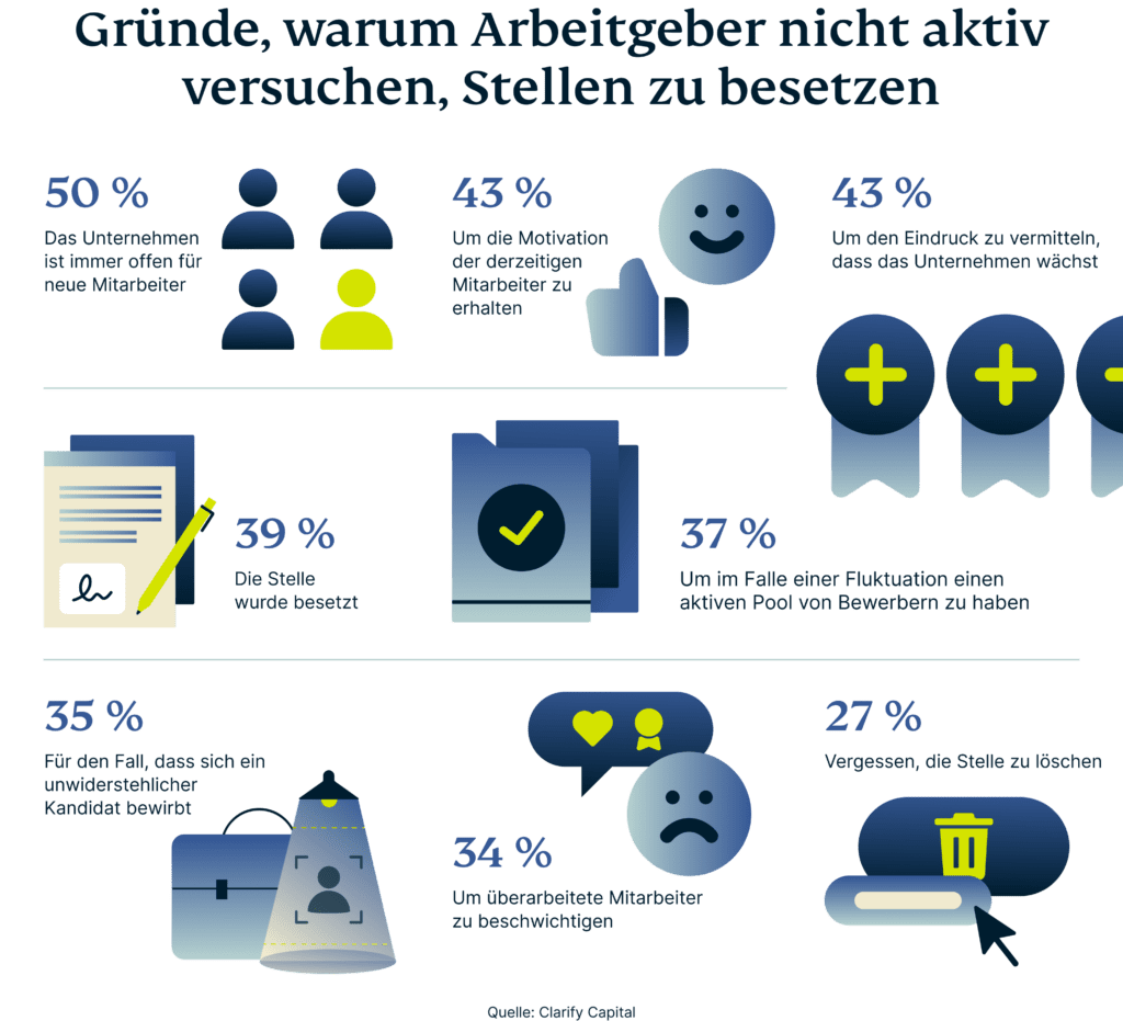 .. - Eine Studie von Clarify Capital hat ergeben, dass 43 % der Ausschreibenden eines Geisterjobs dies tun, um den Eindruck zu erwecken, dass das Unternehmen wächst, während viele Arbeitgeber Geisterjobs nur für den Fall veröffentlicht lassen, dass sich ein guter Kandidat bewirbt.