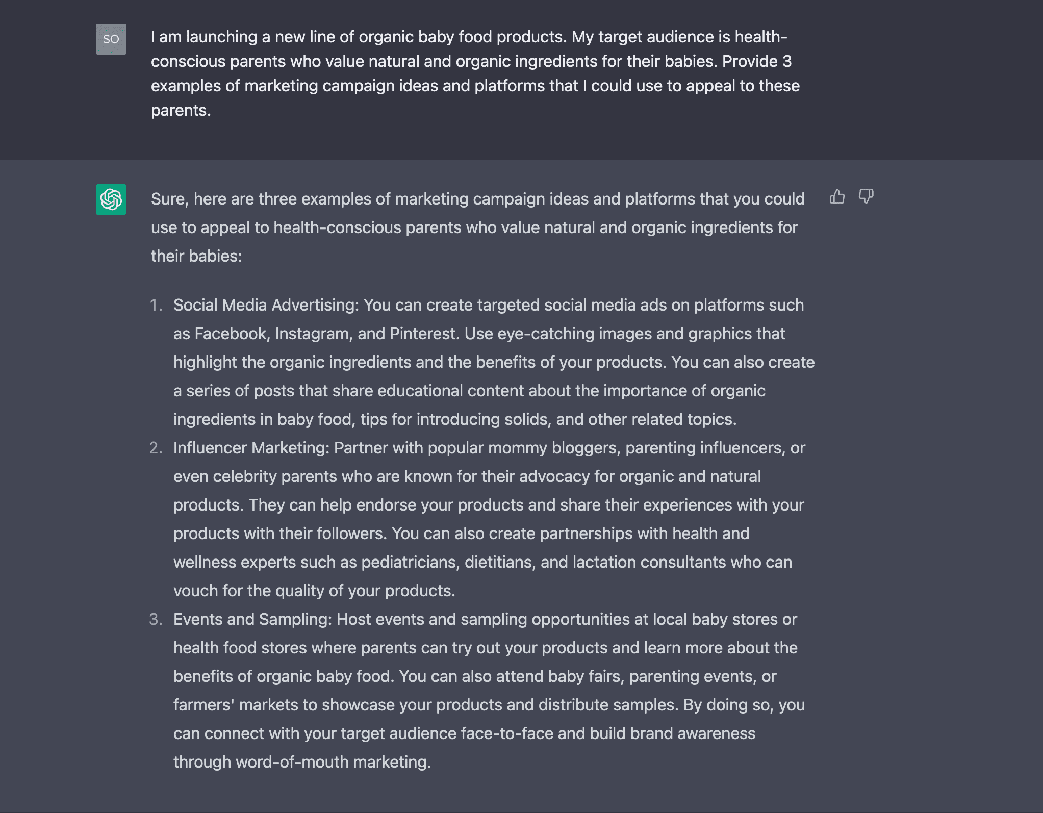 Una forma de generar nuevas ideas es ponerse en el lugar del público al se dirige. Por ejemplo, si está intentando generar ideas de marketing para un nuevo producto, puede pedirle a ChatGPT que piense como un cliente potencial y le de información sobre lo que le atraería.