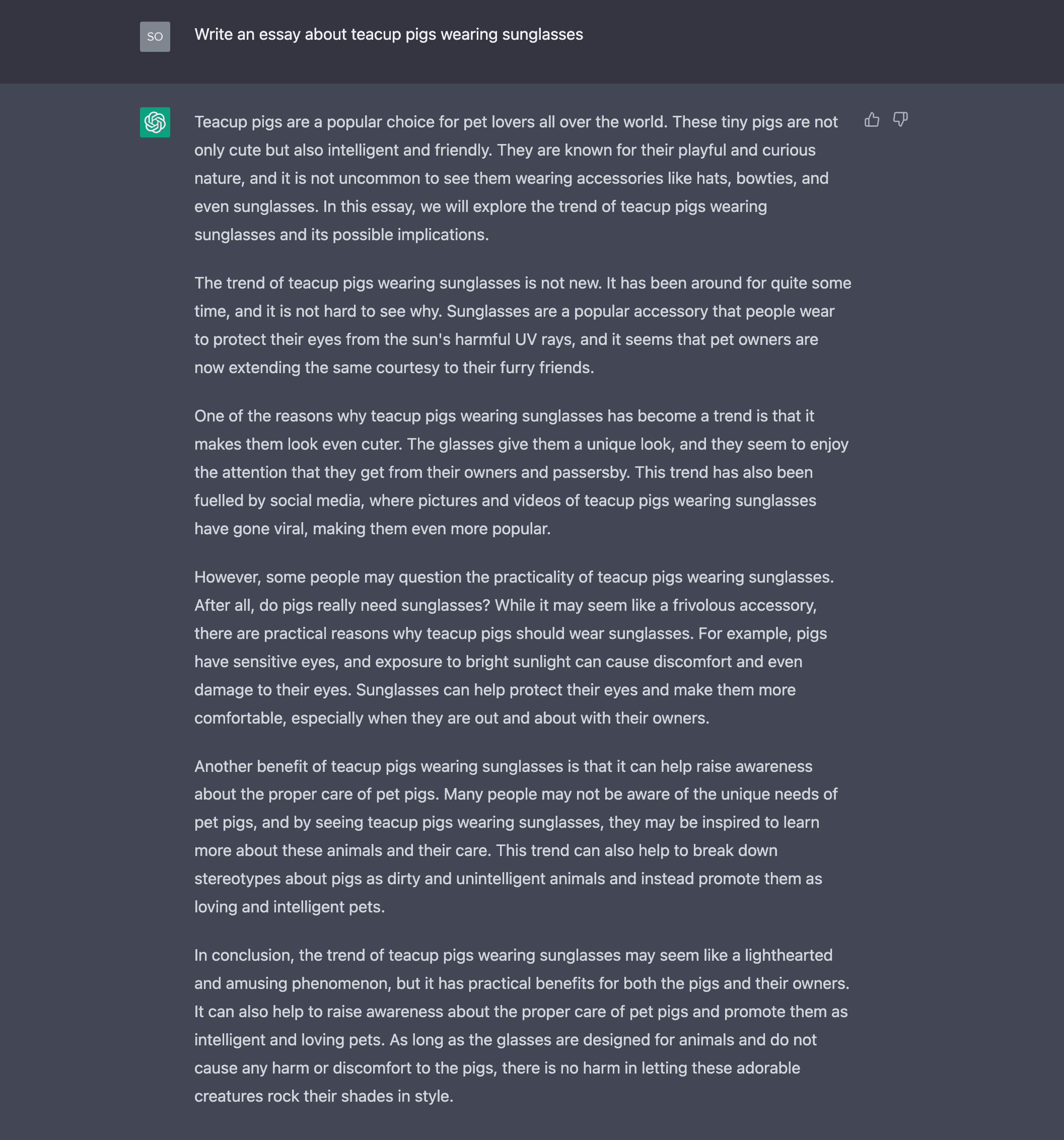Si le pide a ChatGPT "escribir un ensayo sobre mini cerditos que usan gafas de sol", por ejemplo, la IA generará un artículo aburrido y sencillo que poco satisface su solicitud.