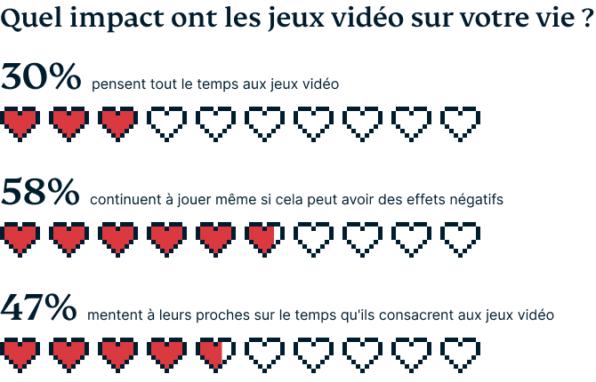 Être incapable de trouver du plaisir en dehors de l'univers du gaming peut conduire à une obsession pour les jeux vidéo et à négliger des activités quotidiennes essentielles comme manger, avoir des interactions sociales, dormir et travailler. Plus inquiétant encore, plus de la moitié des personnes interrogées avouent souvent continuer à jouer, tout en sachant que cela pourrait avoir un impact négatif sur leur vie quotidienne.