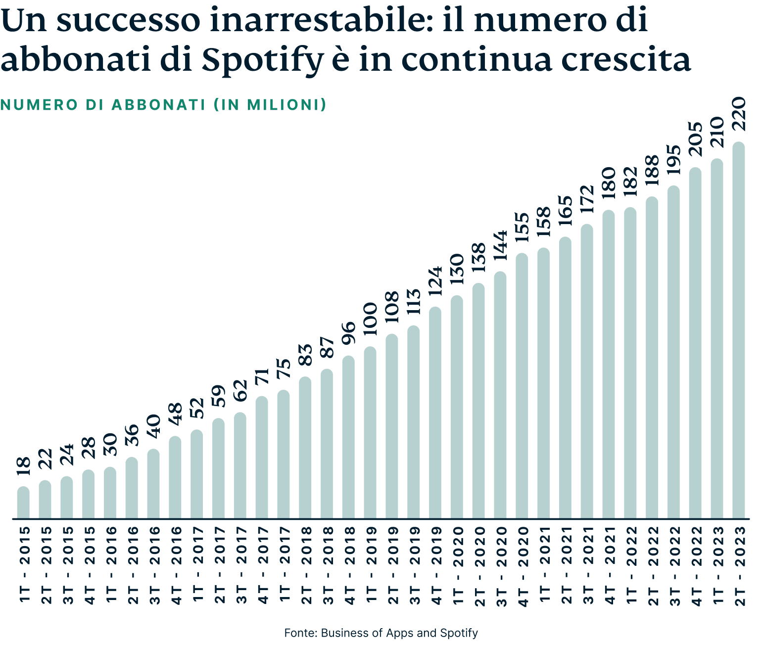 Secondo un report dell'International Music Summit, Spotify è il campione in carica nel mondo dello streaming musicale. Nel 2022, la base di abbonati di Spotify rappresentava quasi il 31% della quota di mercato mondiale, un numero che si prevede sarà ancora più alto entro la fine del 2023. Seguono Apple Music, con una quota del 13,7%, e Tencent Music, con il 13,4%.