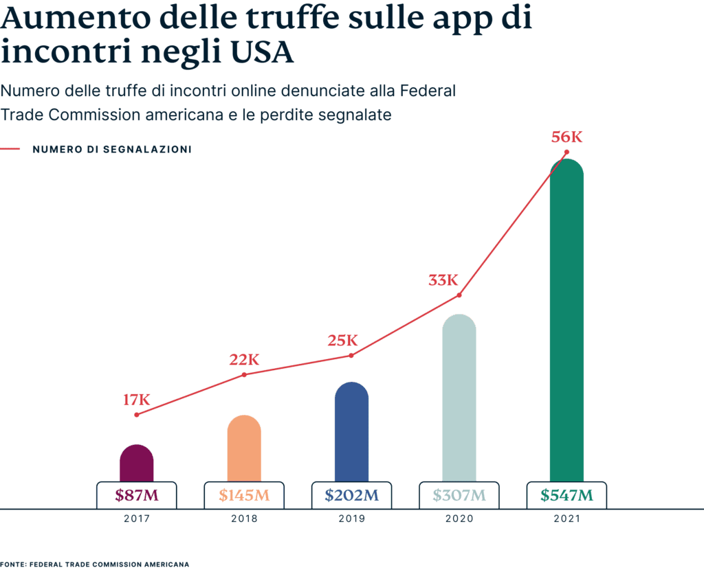 A conferma di questi dati, secondo un rapporto pubblicato dalla Federal Trade Commission (FTC) degli Stati Uniti sulle truffe amorose, solo nel 2021 si è registrata una perdita di 547 milioni di dollari a causa di raggiri su siti di dating, un aumento dell'80% rispetto all'anno precedente e un numero destinato a crescere con il progressivo aumento di iscrizioni sui siti di incontri online.