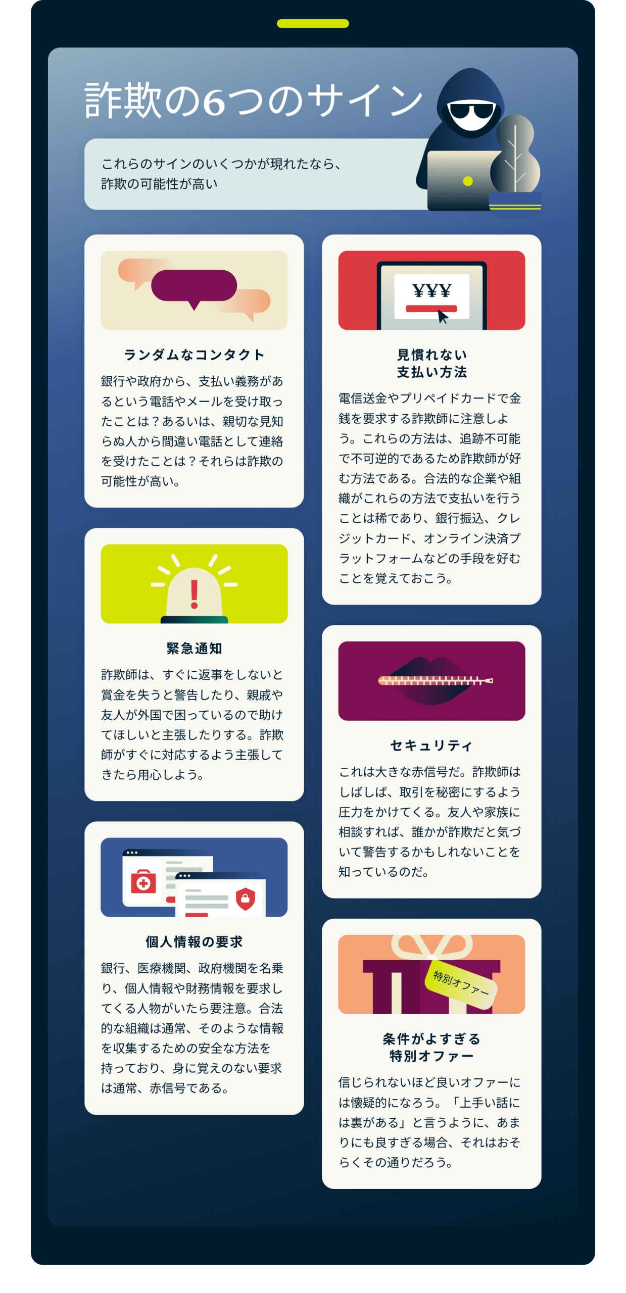 詐欺師は、お金や個人情報を盗む新しい方法を常に開発しています。ここでは、気を付けるべき最も一般的な詐欺の手口をご紹介します。