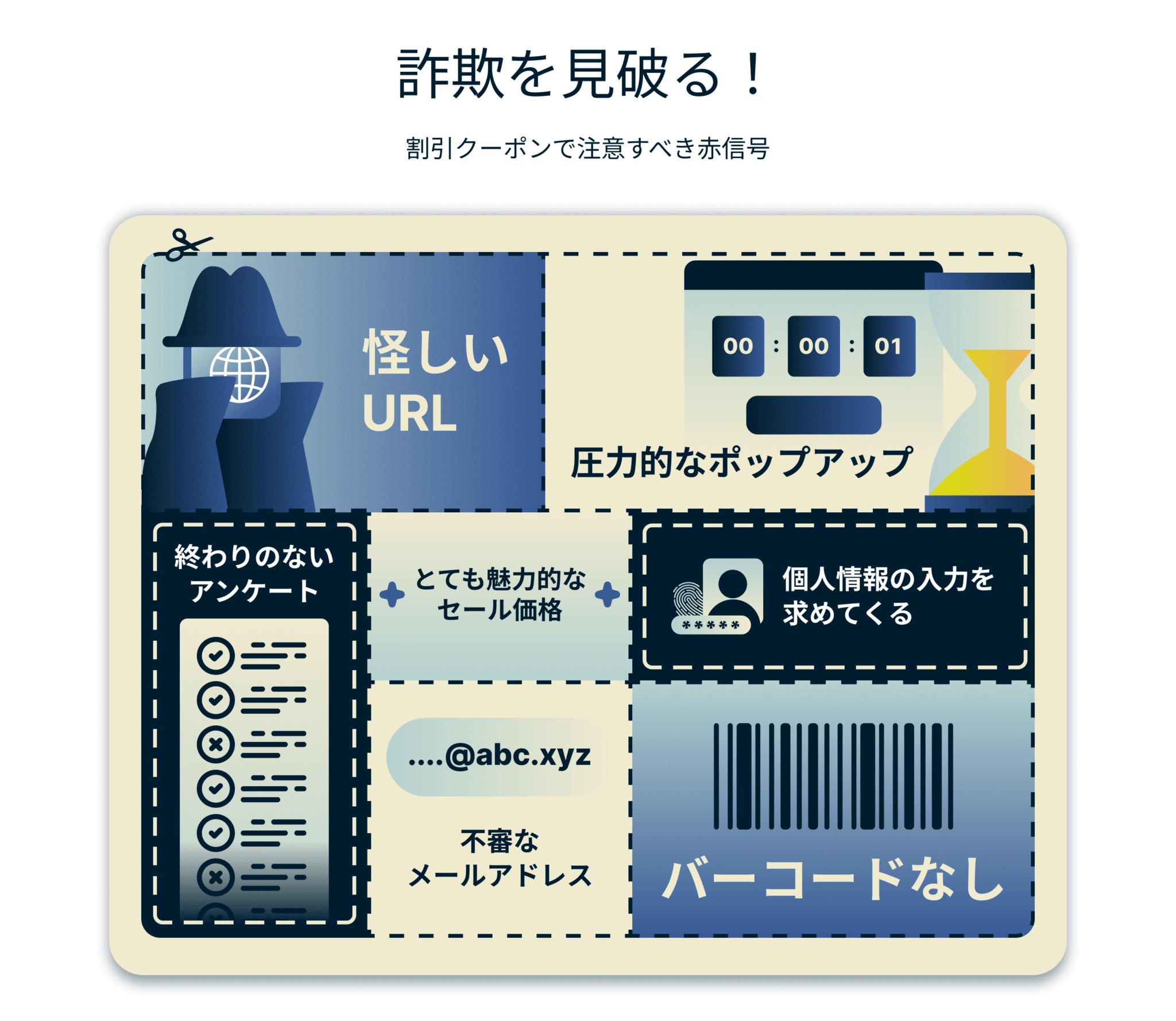 セール情報を探していると、「すべてのクーポンを一か所に集めた」とするウェブサイトに遭遇することがあります。しかし、便利そうに見えるこのサービスも実は詐欺です。偽のクーポンまとめサイトは、便利さを装って個人情報を収集するために作られており、割引を手に入れるどころか詐欺の罠にはまってしまうことになります。