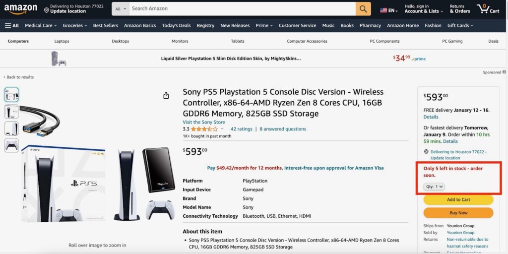 Winkeliers geven vaak de boodschap "Nog maar X op voorraad" om een gevoel van urgentie te creëren. Deze aanpak maakt gebruik van onze FOMO en zorgt ervoor dat producten exclusiever lijken, waardoor klanten sneller een aankoopbeslissing nemen. Amazon en hotelboekingssites zoals Agoda maken bijvoorbeeld vaak gebruik van deze tactiek door waarschuwingen over beperkte voorraad/beschikbaarheid te tonen om klanten sneller een beslissing te laten nemen.