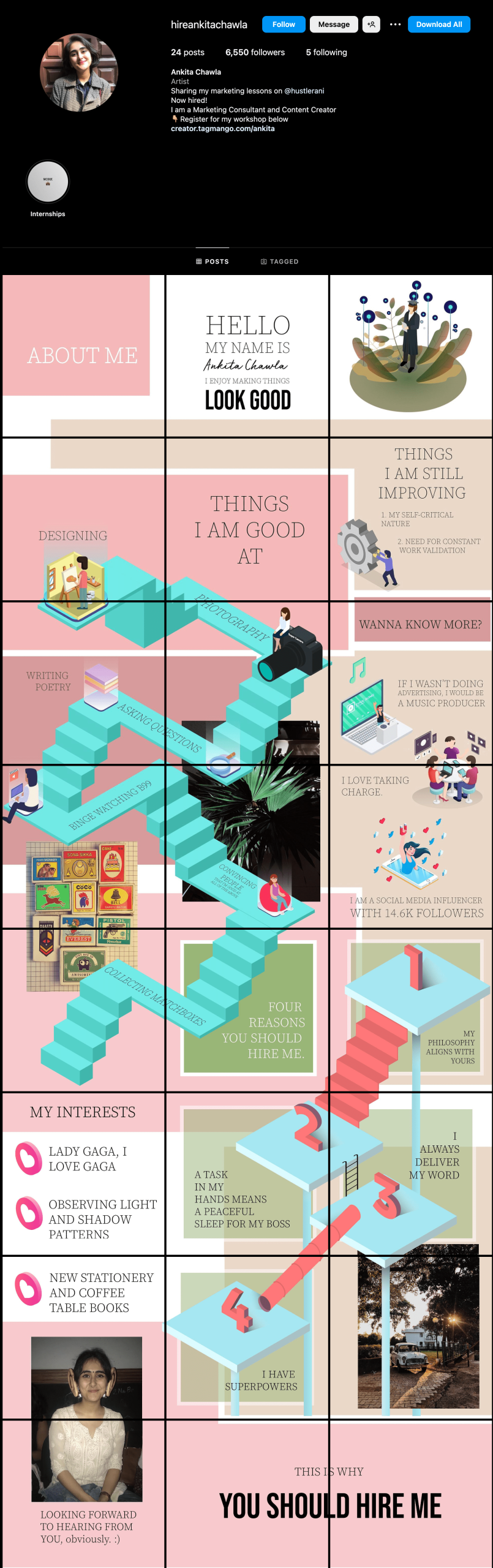 For example, Ankita Chawla, a user based in India, turned her personal Instagram account into a creative showcase of her skills and abilities. She designed her résumé as a collage and posted it on her profile, leading to her being hired as a visual creator at Deloitte India.