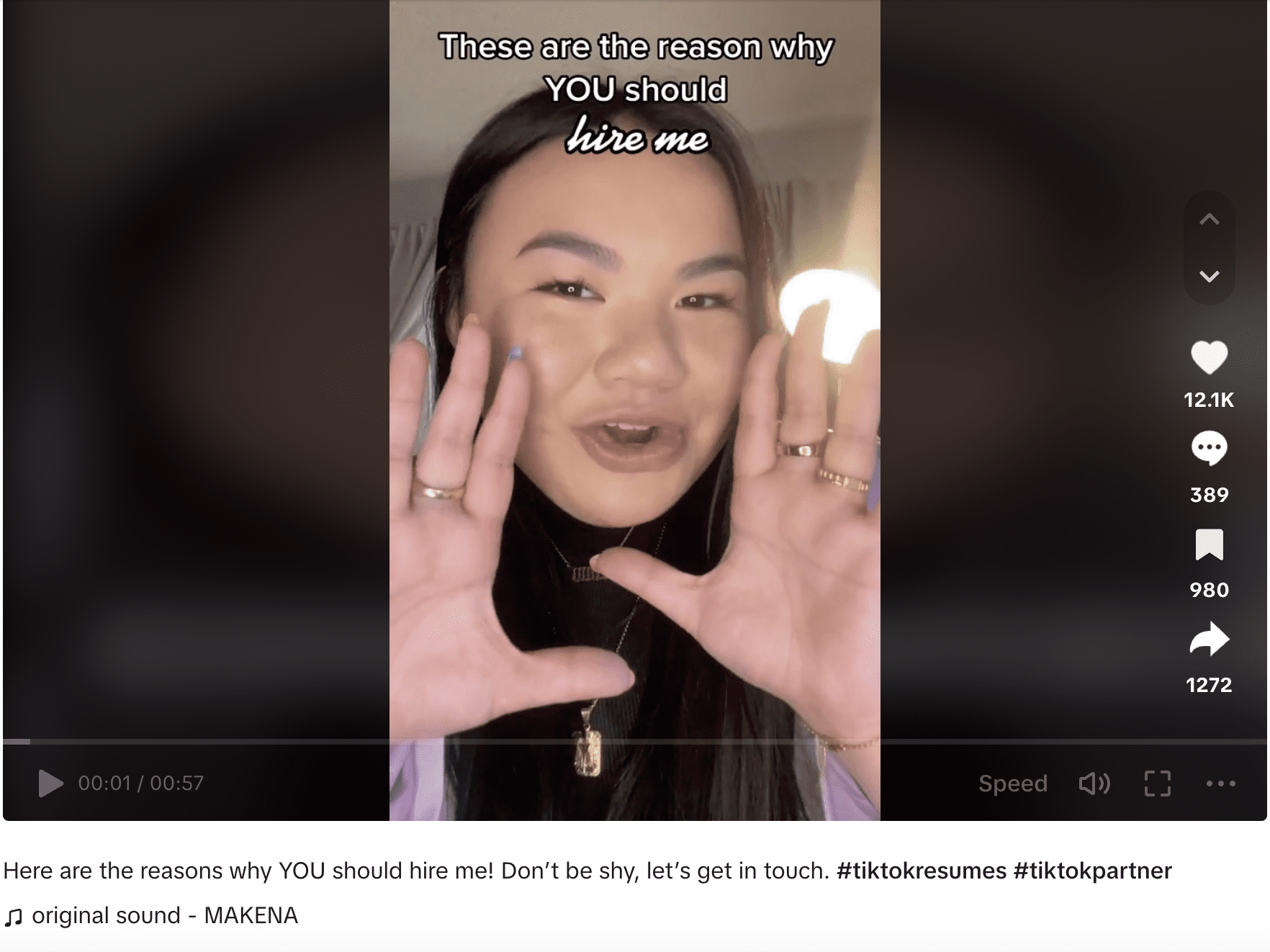 “These are the reasons why you should hire me”, says Makena Yee, a 23-year-old applicant from Seattle, as one of TikTok Resumes’ success stories. After her video résumé went viral, she accumulated millions of views and hundreds of comments, including phrases like "Someone hire herrrr!". Yee received more than 15 job leads.