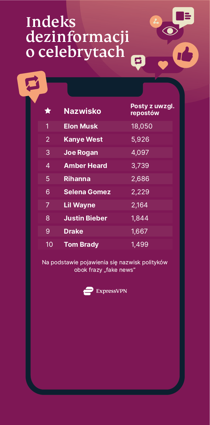W tym badaniu przyjrzeliśmy się najczęściej wyszukiwanym w sieci celebrytom, wykorzystując dane z serwisów społecznościowych, aby dowiedzieć się, jak często ich nazwisko było powiązane z frazą „fake news” w okresie od stycznia do października 2022 roku. Następnie uszeregowaliśmy celebrytów na podstawie kilku czynników, w tym liczby postów, repostów, wyświetleń i interakcji.