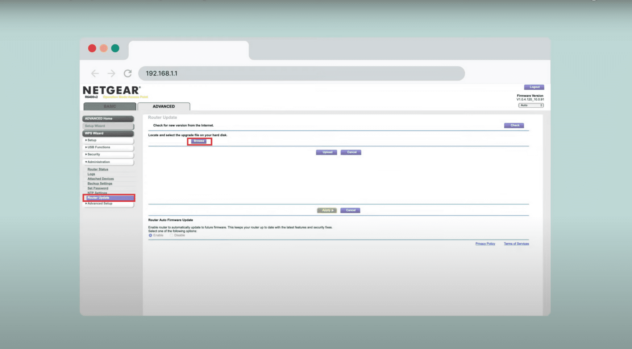 Por exemplo, em roteadores Netgear, você precisará selecionar a aba Advanced (Avançado), depois navegar até Administration (Administração) e, em seguida, selecionar Router Update (Atualização do Roteador).