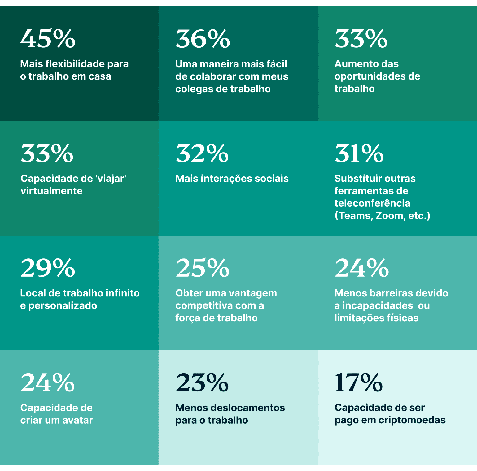 • Quem está interessado? 77% dos empregadores manifestaram interesse em ambientes de trabalho imersivos como o metaverso, em comparação com apenas 57% dos funcionários. (Ir para esta seção.)
